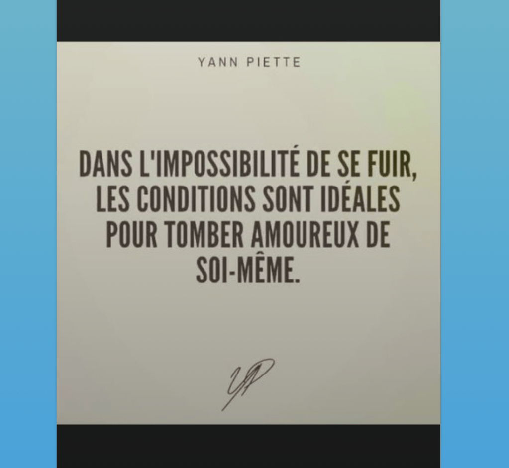 belle occasion de passer du temps avec soi-même que cette situation en effet… du temps sans distance pour apprendre à s’aimer davantage, et à découvrir tous les petits racoins cachés de notre âme qu’on n’avait pas tant à explorer auparavant, trop occupé(e) à parcourir le monde ou à jazzer avec des ami(e)s (salut tatie 😉