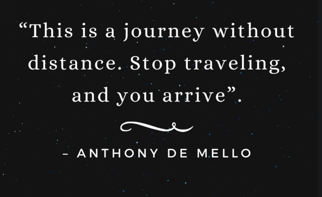 traduction: ce voyage ne se calcule pas en terme de distance… arrête de t’éparpiller et tu réaliseras que tu es déjà arrivé(e) à destination… – Anthony De Mello