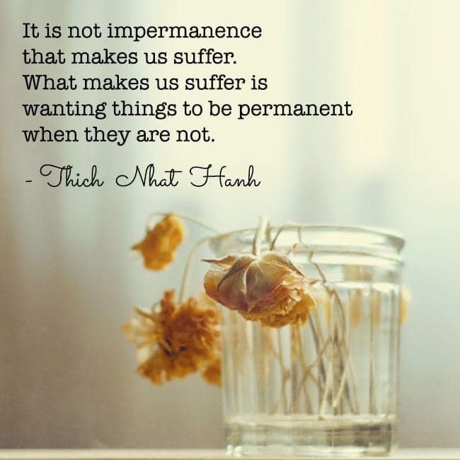traduction: ce n’est pas l’impermanence qui nous fait souffrir, c’est plutôt de vouloir que les choses le soient alors qu’elles ne le sont pas… – Thich Nhat Hanh