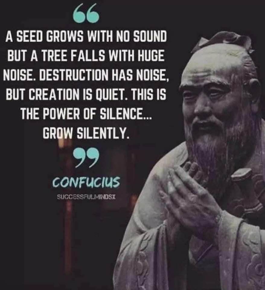 traduction: une graine germe sans faire de bruit… mais un arbre tombe avec fracas… la destruction est bruyante mais la création est paisible et délicate… ceci est la puissance du silence… croit silencieusement… – Confucius