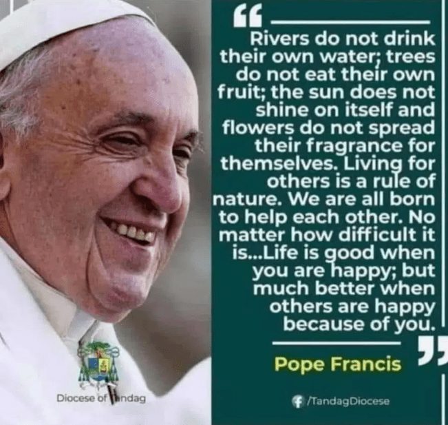 traduction: les rivières ne boivent pas leur propre eau; les arbres ne mangent pas leur propres fruits; le soleil ne luit pas pour lui-même, et les fleurs ne propagent pas leur fragrance pour elles-mêmes… vivre pour autrui est une loi naturelle… nous sommes né(e)s pour s’aider les un(e)s les autres… peu importe combien cela peut être difficile… la vie est bonne quand êtes heureux mais encore meilleure quand les autres sont heureux grâce à vous… – Pape François…