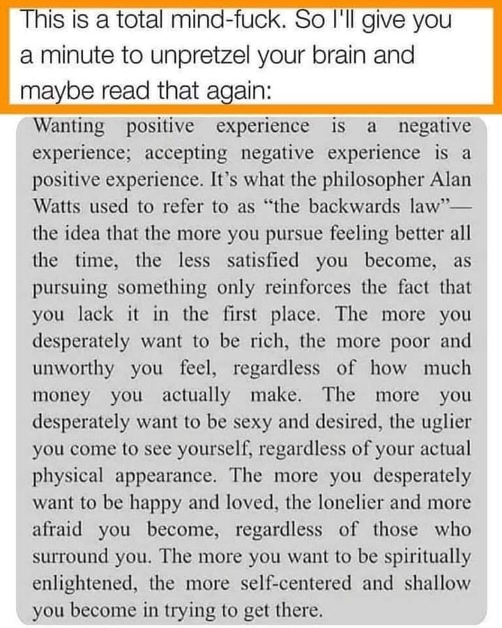 vouloir une expérience positive constitue une expérience négative… et accepter une expérience négative est une expérience positive… c’est ce que le philosophe Alan Watts nommait la «loi inversée»… qui implique que plus vous poursuivez le désir de vous sentir bien en tout temps et plus vous devenez insatisfait(e) car la poursuite de quoi que ce soit ne fait qu’en renforcer son prétendu manque… plus vous voulez devenir riche, plus vous vous sentez pauvre et sans valeur, peu importe votre richesse du moment… plus vous désirez être sexy et désiré(e) et plus laid(e) vous vous sentirez, sans égard à votre apparence physique… plus vous désirez être heureux et aimé(e), plus vous vous sentirez seul(e) et apeuré(e), peu importe les gens qui vous entourent… et plus vous désirez être «illuminé(e) spirituellement», plus vous serez centré(e)s sur votre petit nombril et superficiel(le) en tentant d’atteindre cet état…