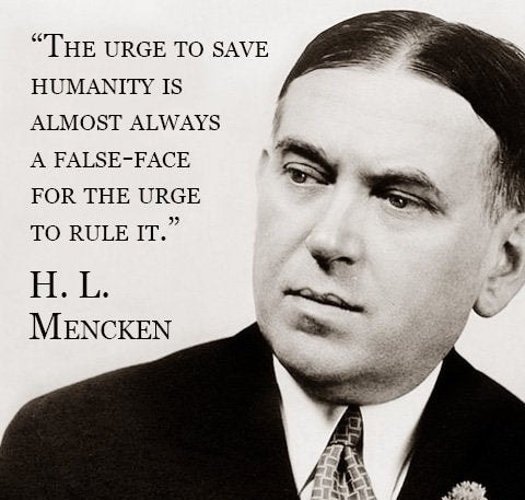 traduction: la volonté de sauver l’humanité est presque toujours un faux prétexte qui cache un désir de vouloir la contrôler… – H. L. Mencken