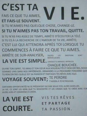 la Vie ne se contrôle pas, ne se change pas comme bon nous semble… pas une émission de télé la Vie… le canal Vie ça n’existe pas ! parfois plutôt un traitement de canal la Vie… elle est simplement ici, là, ailleurs, partout, mettant sur notre chemin des personnes ou des événements qui nous font grandir, nous confrontent, nous ennuient, nous dérangent, nous enragent ou nous enflamment…