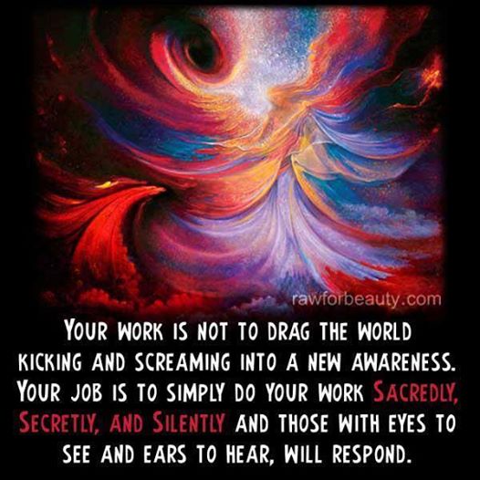 traduction : votre job ne consiste pas à tirer le monde vers une nouvelle conscience en brassant la baraque ou en criant… votre job consiste seulement et simplement à faire votre travail d’une façon sacrée, secrète et silencieuse et ceux et celles qui ont les yeux pour voir et les oreilles pour entendre vont répondre…