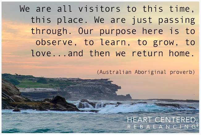 traduction : nous sommes tous et toutes des visiteurs en ces temps et ces lieux… nous ne faisons que passer… notre mission ici consiste à observer, apprendre, grandir et aimer… et ensuite à retourner à la maison… – proverbe aborigène australien